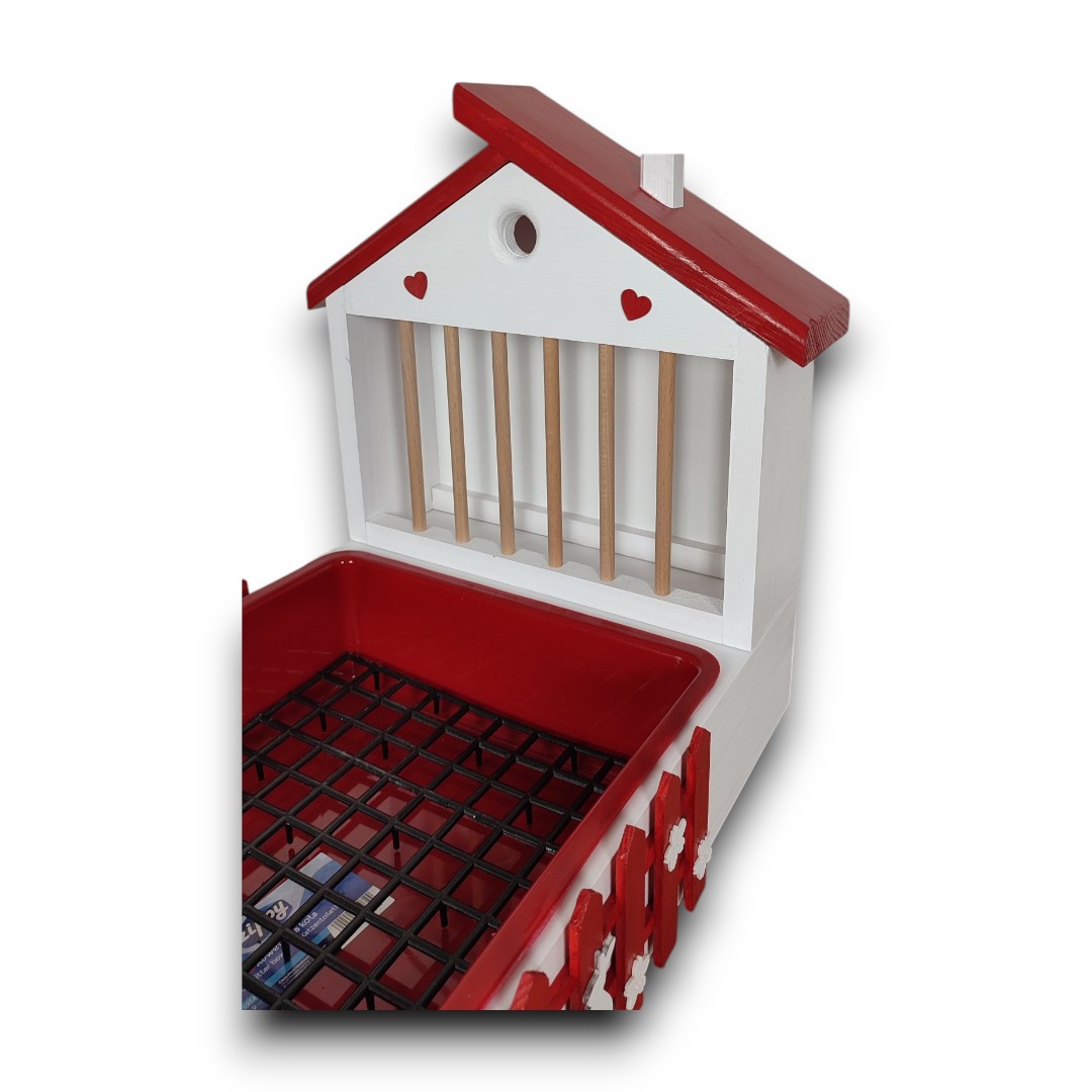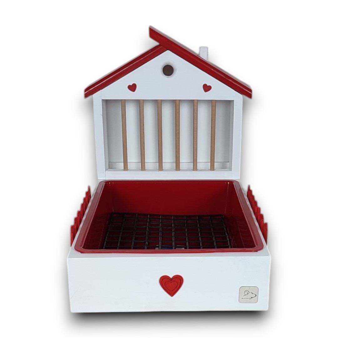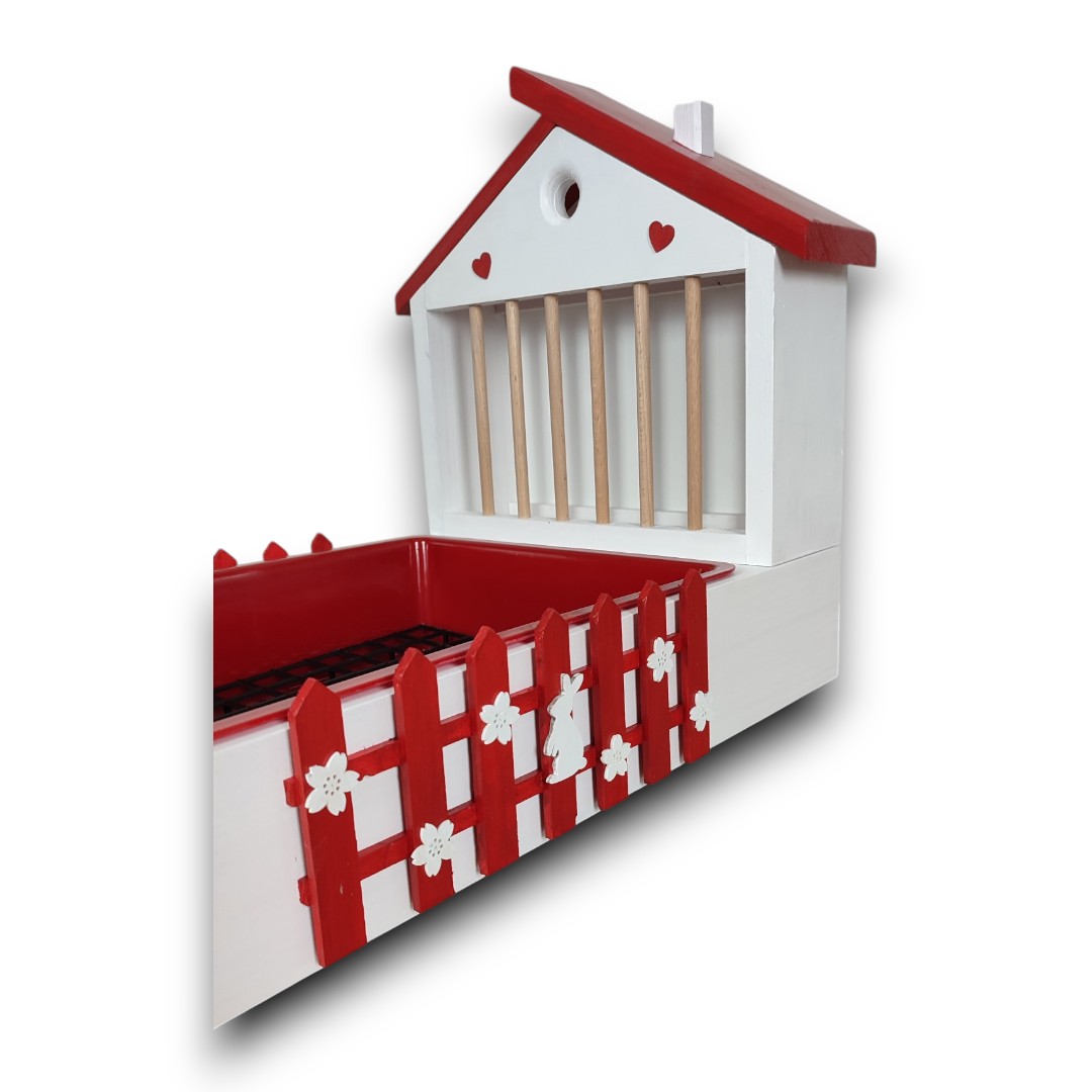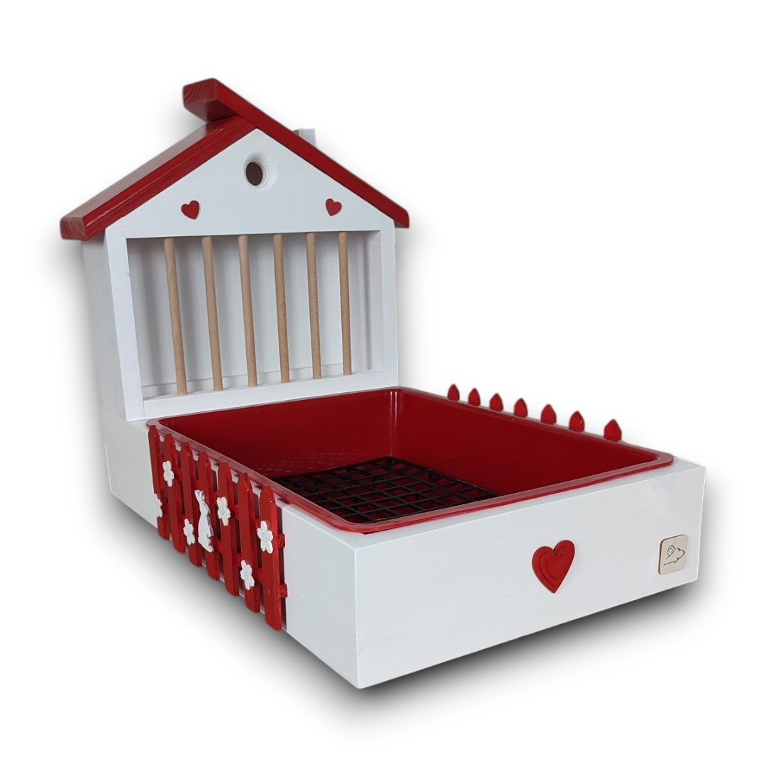 Design – biały domek z czerwonym płotkiem z kwiatowymi ozdobami i króliczkiem plus czerwony daszek przywodzi na myśl bajkową scenerię, która zachwyci zarówno Ciebie, jak i Twojego pupila. No i te serca!!!