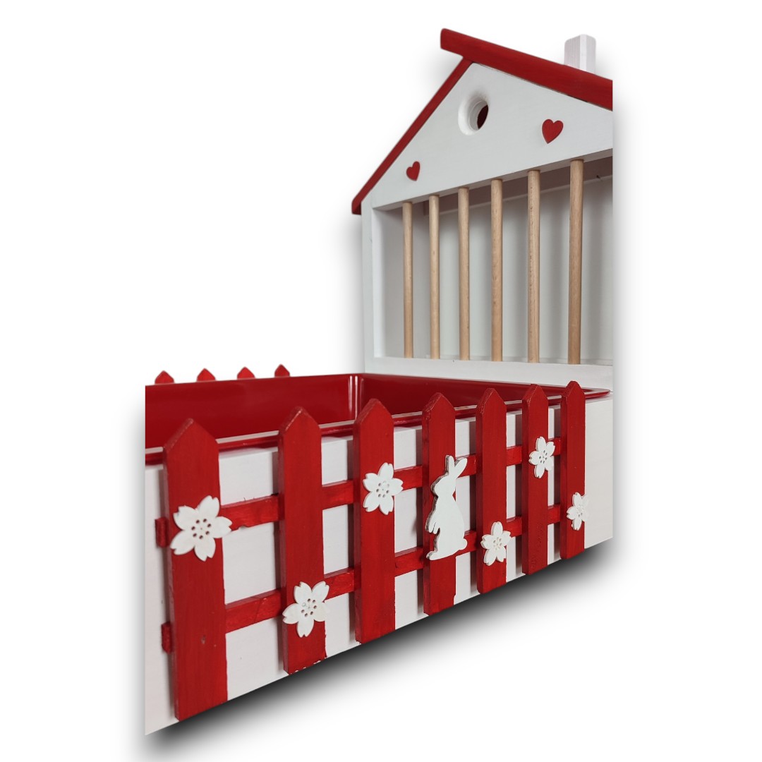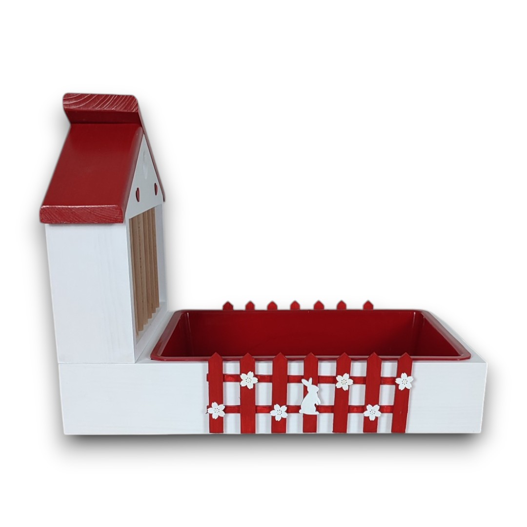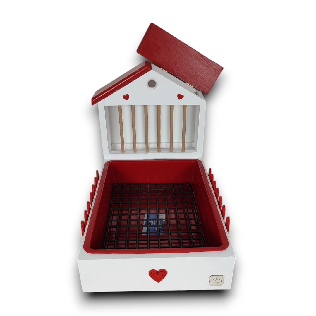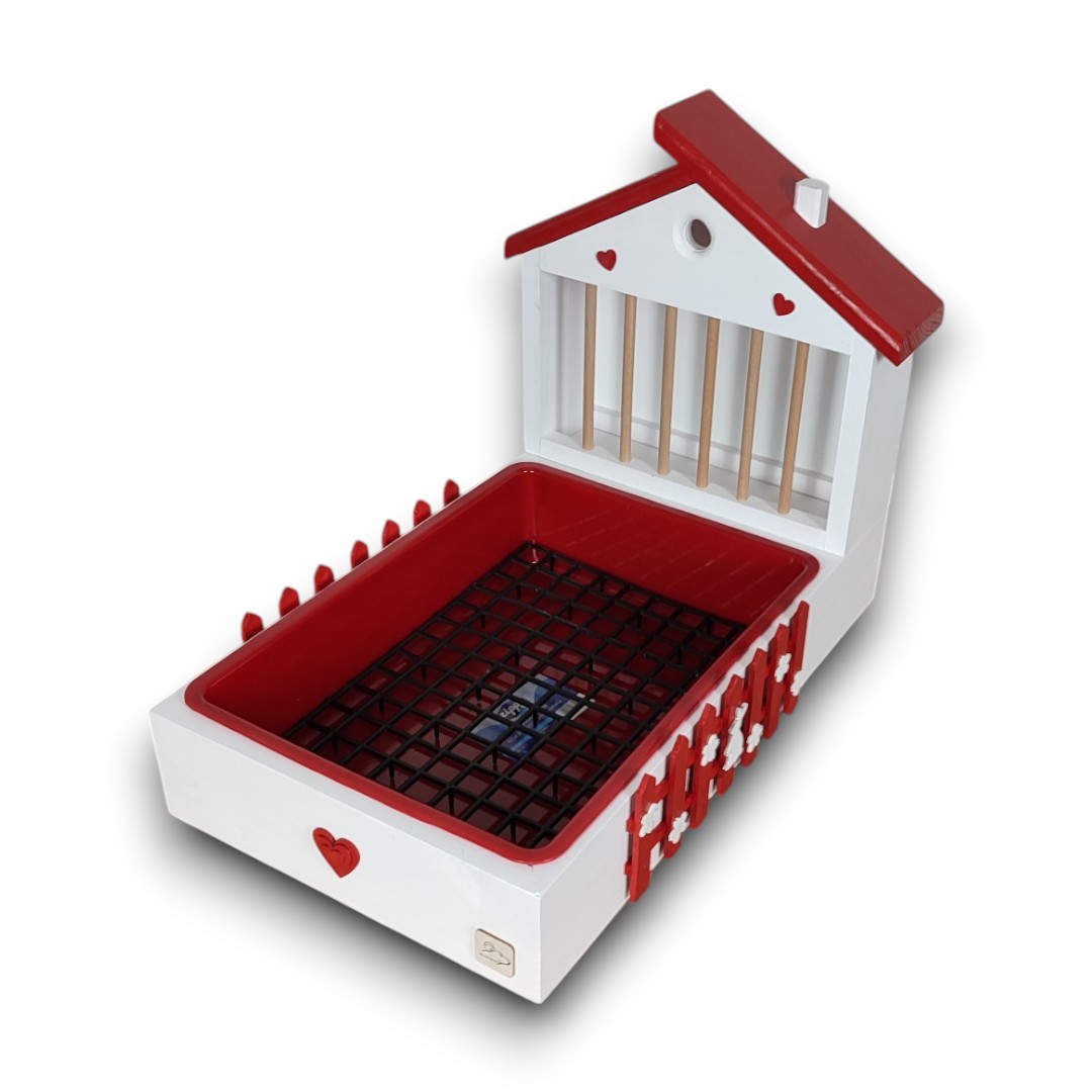 Design – biały domek z czerwonym płotkiem z kwiatowymi ozdobami i króliczkiem plus czerwony daszek przywodzi na myśl bajkową scenerię, która zachwyci zarówno Ciebie, jak i Twojego pupila. No i te serca!!!
